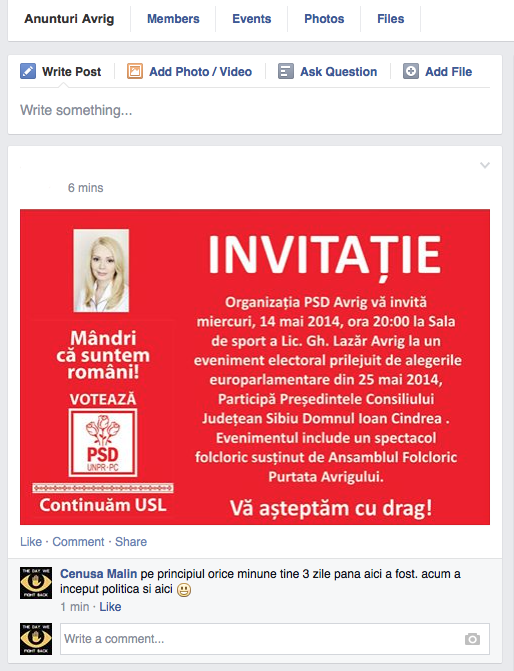 Postare care ulterior a si disparut ca urmare a comentariului pe care l-am facut fiindca probabil astia de la PSD si-au dat seama ca odata prezent pe grupul respectiv le pot strica orice tentativa de propaganda electorala.