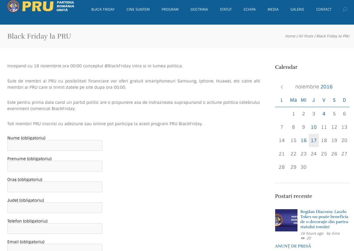 Conform unei postari de pe siteul oficial al Partidului Romania Unita (PRU), partid pe la care s-a aciuat si prietenul nostru Gheorghe Fraticiu, toti membrii PRU cu posibilitati financiare nemarginite (in concluzie si domnul Gheorghe Fraticiu) vor oferi celorlalti membri PRU fara posibilitati financiare nemarginite smartphone-uri iPhone, Samsung, Huawei si altele introducand astfel conceptul de Black Friday si in lumea politica: