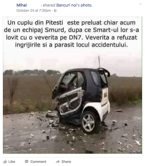 In alta ordine de idei, directorul scolii in cauza da share pe Facebook la glume de santier despre accidente rutiere pentru ca asa-i sade bine unui director de scoala, sa faca haz pe marginea unei tragedii si mai ales sa faca haz in contextul in care Romania are unul dintre cele mai mici nivele de promovabilitate a scolii de soferi din UE (asta cu tot cu permisele luate pe spaga si pile) si in contextul in care Romania e pe primul loc la numarul de victime in cazul accidentelor rutiere: