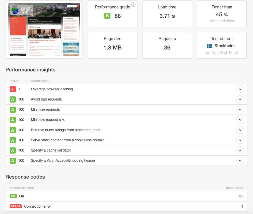 Noul site sta chiar foarte bine la subiectul performanta din moment ce incarca o pagina de 1.8 MB (dublu fata de siteul vechi) in 3,71 secunde si are un grad de performanta B cu 88 de puncte si un singur aspect care odata rezolvat ii poate aduce grad de performanta A si un timp de raspuns mult mai bun:
