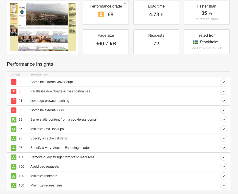 Vechiul site avea un grad de performanta D cu 68 de puncte si un timp de incarcare de 4,73 secunde la o marime a paginii de 960,7 kB. In mod normal, daca era optimizat corect la dimensiunea actuala a paginii timpul de incarcare trebuia sa fie de maxim 1 secunda: